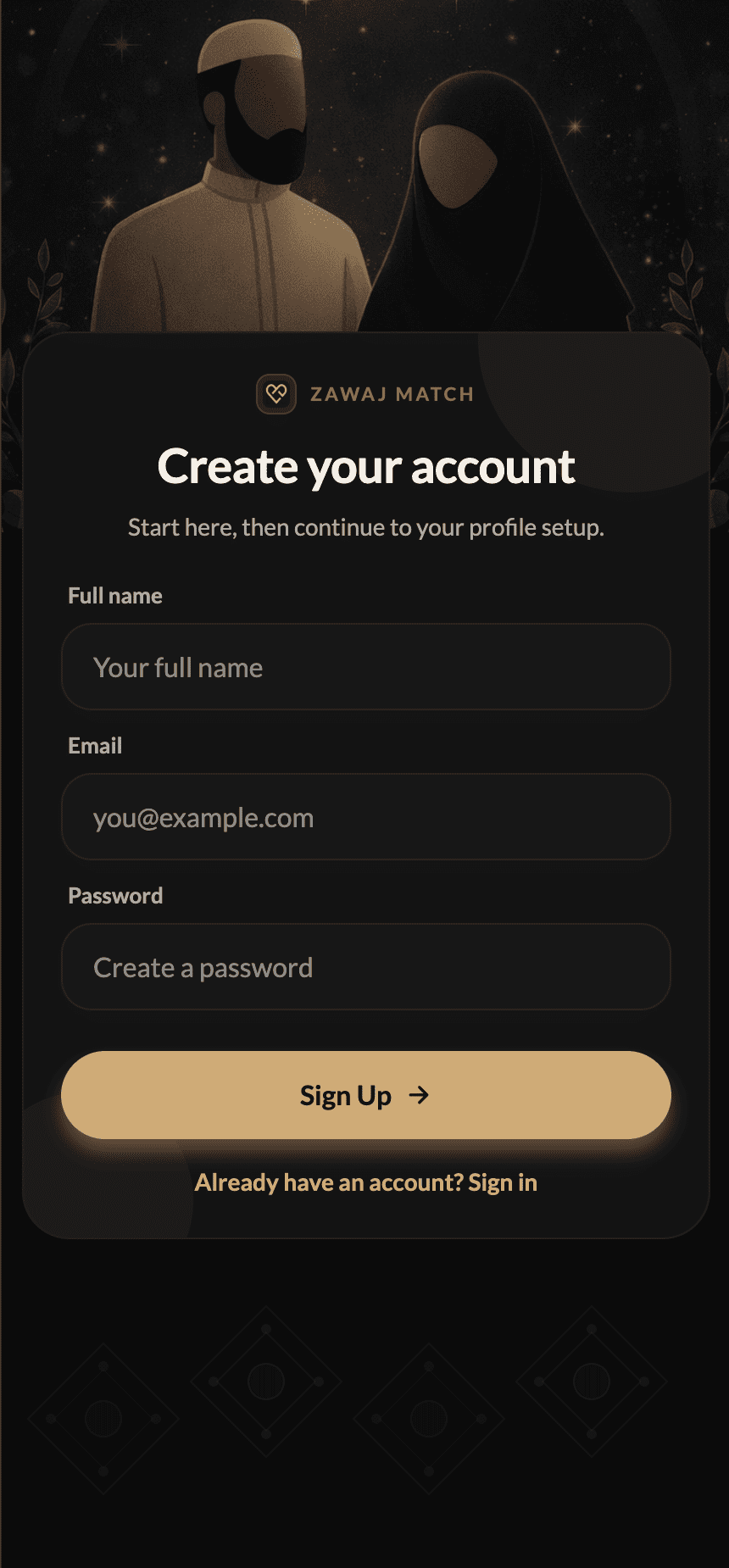 A halal-first onboarding flow with clear boundaries and serious intentions.